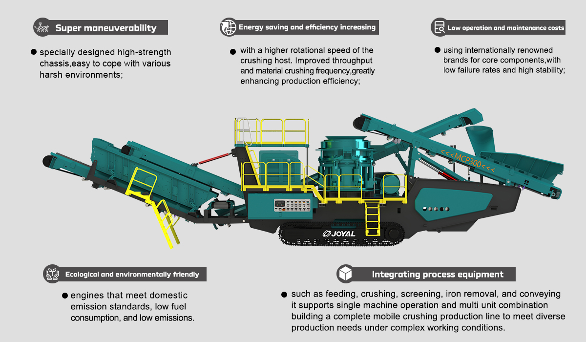 Applications: Mainly using sand and gravel aggregates and construction waste for crushing. Strong mobility, good on-site mobility, suitable for complex construction environments such as mountainous areas and wetlands
